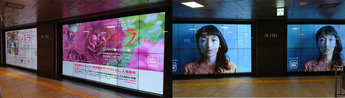 駅構内に隣接する24面マルチサイネージ。百貨店イベントの告知のほか、ポップアップストアのタイアップ広告媒体としても活用。 ■導入サービス: デジタルサイネージ・設置場所:西武百貨店1F 西武線池袋駅コンコース・取り組み範囲:既存設備のリプレイス:プロジェクト設計、モニター以外の機器手配および設定・検証、配信システム導入・目的:販促告知、広告媒体
